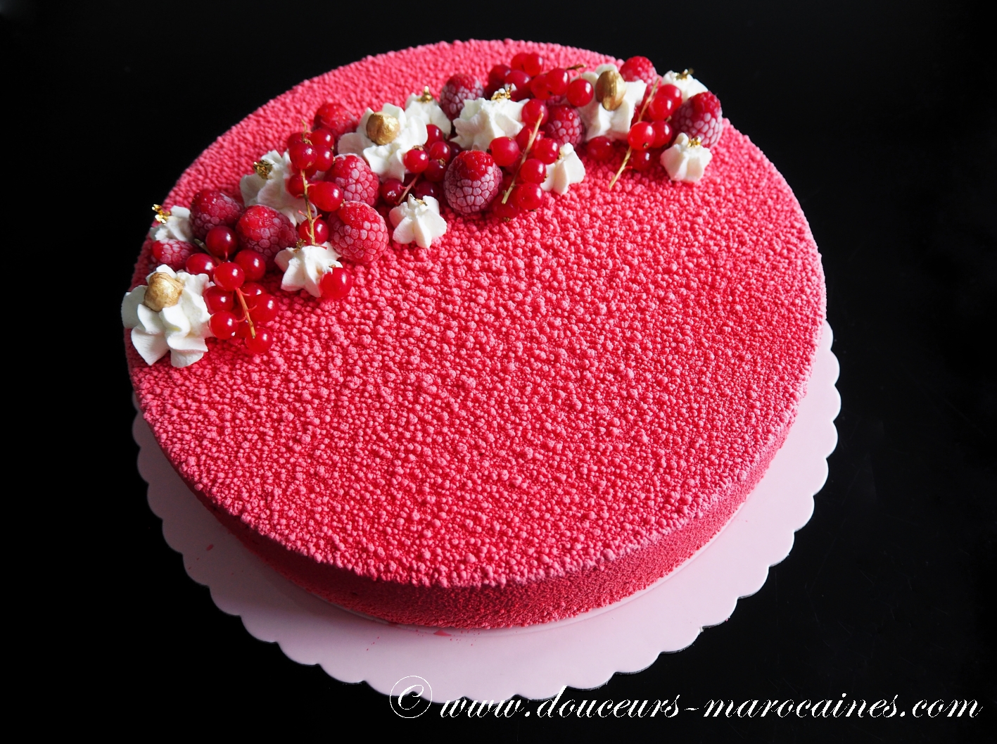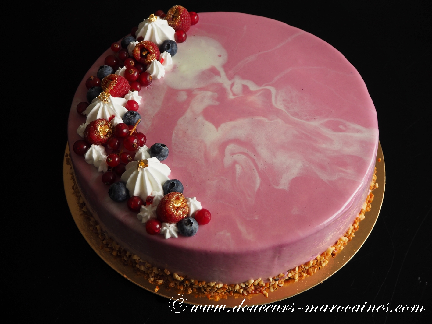 Une œuvre d’art à déguster. Sous un glaçage miroir marbré d’une finesse rare, cet entremet révèle une mousse onctueuse aux fruits rouges et un cœur fruité intense. Sa base croquante aux noisettes et son décor de framboises, myrtilles et groseilles apportent un équilibre parfait entre douceur et acidité. Une création lumineuse et raffinée pour vos célébrations