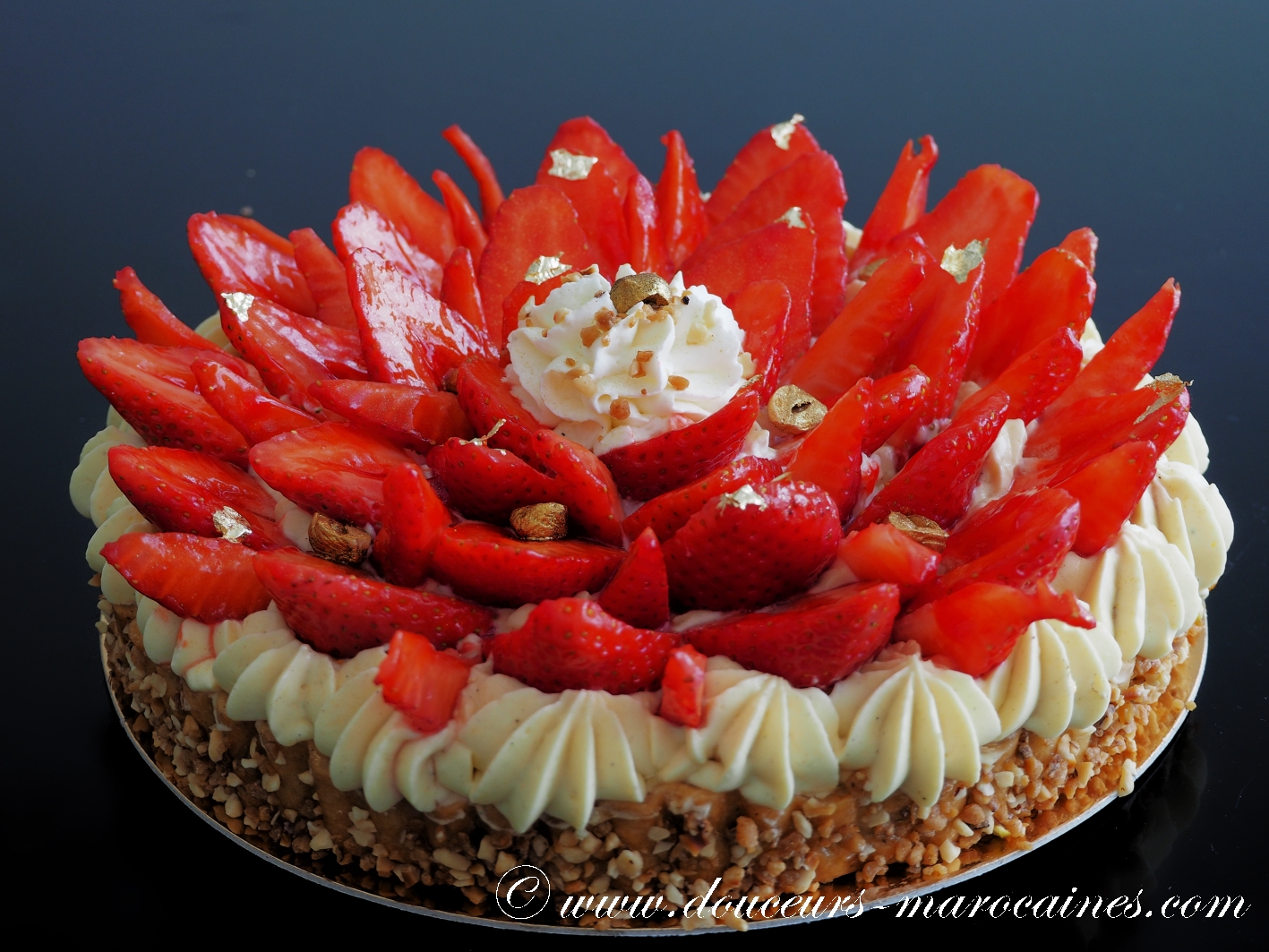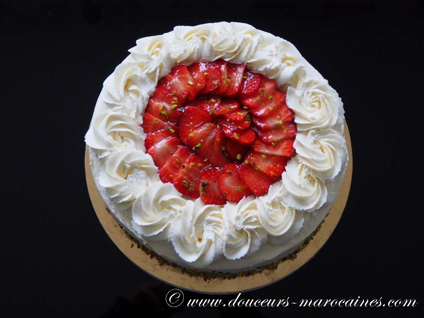 L’élégance d’un jardin en fleurs. Ce gâteau d’exception marie la légèreté d’une crème montée en rosaces à la vivacité des fraises fraîches nappées d’un délicat sirop. Les éclats de pistaches croquantes apportent une touche finale raffinée à ce dessert tout en contraste, idéal pour célébrer vos moments les plus précieux avec une note de fraîcheur absolue.